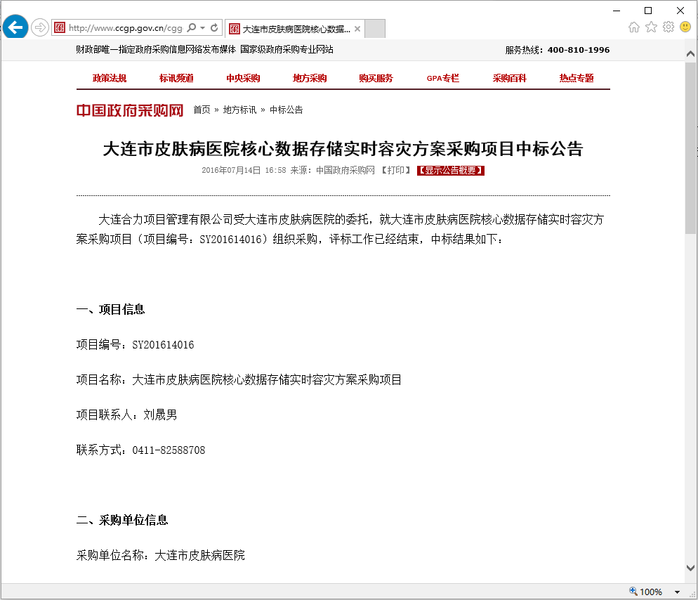 祝賀公司中標大連某某醫(yī)院核心數(shù)據(jù)存儲實時容災方案采購